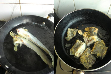 鲶鱼去除内脏,清洗干净。炒锅洗净上灶,放入大半锅清水,开大火煮沸,将鲶鱼放入焯一下,捞出锅,用清水冲洗掉鱼身表面的粘液。将焯过水的鲶鱼切成小段,放入鸡蛋液中,使鲶鱼段均匀地裹上蛋液。平底锅洗净上灶,放入少许油,油热之后,将裹上蛋液的鲶鱼段下锅煎制,煎成双面微黄后关火待用。