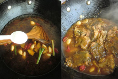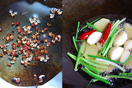 大蒜剥掉外皮,葱洗净切段,生姜去皮切片,泡椒和红辣椒洗净切小段待用。炒锅洗净放油,油烧热之后,放入适量豆瓣酱煸炒。豆瓣酱炒出香味之后,将葱姜蒜、红椒和泡椒下锅炒香。