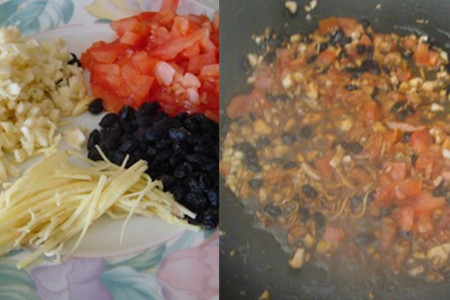 生姜洗净切细丝,大蒜剥皮切细末,西红柿洗净切小丁,香葱洗净切成小粒,豆豉准备好。炒锅洗净上灶,倒入适量油,油热之后,将切好的蒜末下锅爆香。蒜末爆出香味之后,将豆豉、姜丝和西红柿丁下锅煸炒,炒出香味。