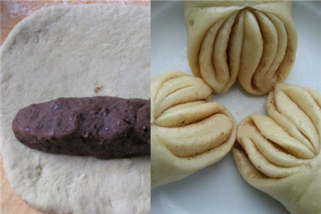 如果是非常喜欢吃豆沙的人,我们还可以在花卷里面放一些豆沙,同样是用刚才的方法,我们只需要把豆沙做好了之后放在圆形的面饼上面,然后把它卷起来,这样豆沙就包裹在面团的里面。其实在面团里面夹杂一些其他的颜色做出来的花卷会更加的好看。