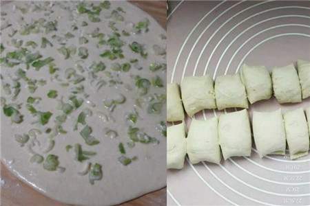 因为我们要做的是有葱花的花卷,所以我们就把葱花放在面粉里面搅拌,把面粉和葱花搅拌均匀之后,那么我们就开始正式的揉面团了。在揉的时候如果发现面团十分的粘手的话,那么我们还要在面团里面加入适量的面粉,直到面团它不会粘在手上为止。
