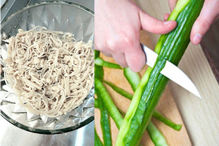 时间到了之后,再把金针菇捞出来,放在容器里面,然后再在容器里面加点水,让它凉置一下。接下来就是处理黄瓜了。对于黄瓜的选择,很多人觉得头疼。比较粗的黄瓜吧,里面的籽比较多,而且还老,但是比较细的话,又总是怕没什么口味。不用担心,只要选择比较嫩的就可以了。为了保证口味的纯正,处理的时候可以把黄瓜削皮。