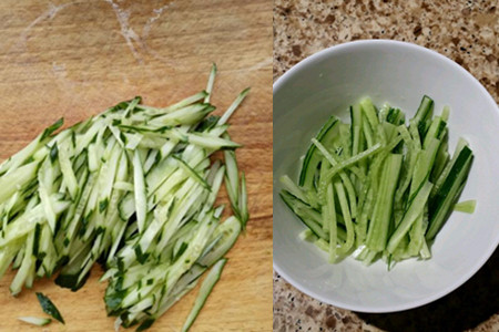 然后就可以进行切丝了。但是要注意,我们不是单纯地腌黄瓜,不能切得太细,要不然夹不住。长度不用太长,适中即可。粗细也要始终,但是也不能太粗,要不然感觉很不细致。切完之后,放置在准备好的碗里面,然后倒入一定的盐进行腌制。盐的用量要把握住度,不能太多,也不能太少。稍微搅拌一下。时间到了之后,倒出多余的水,剩下腌制好的黄瓜丝。