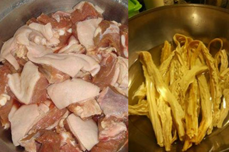 3、把腐竹用刀折成段状,放在清水之中浸泡至软。