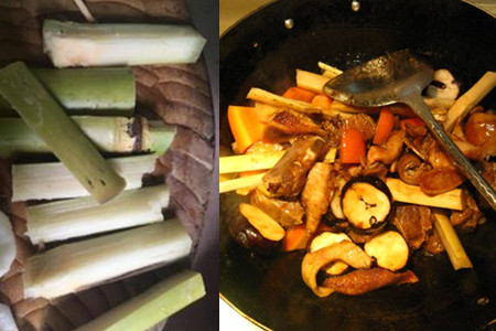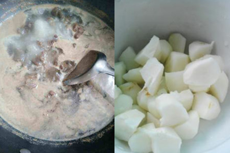 6、把驴肉倒入炖锅中,汤汁大火滚开后。把准备好的马蹄和竹蔗放入炖锅中,紧接着把蒜段加入其中,淋入适当量的冷水。再加入些许的豆瓣酱进行调味,便可盖上盖子,中火慢炖一个钟头上下即可食用了。