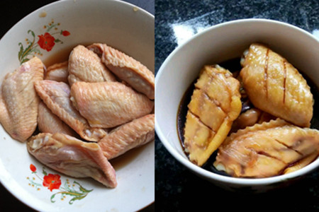 step1、处理鸡翅,借助小刀在每个鸡翅的表面划二到三道口子,该步骤有助于使鸡翅完全入味。