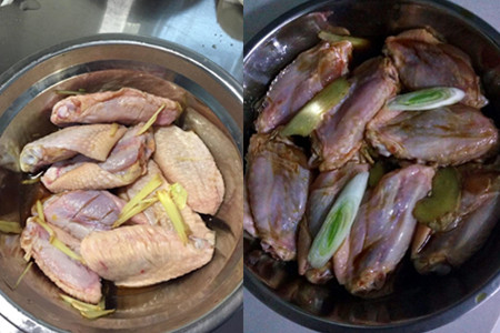 step2、腌制鸡翅。将鸡翅放入事先备好的干净大碗中,依次倒入适量的料酒、老抽和生抽,随后放入剥好的蒜片,数分钟后加入少量的盐和味精,紧接着你需要将所有食材都抓匀,进行腌制,时间控制在十分钟左右。