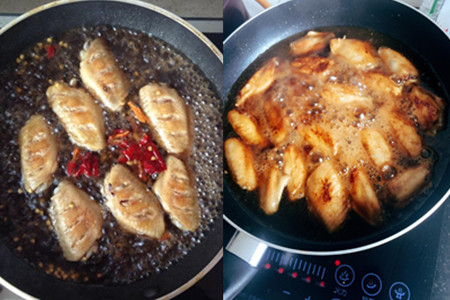 step8、调转至中火火候,待可乐被完全煮干即可借助筷子将鸡翅装盘。