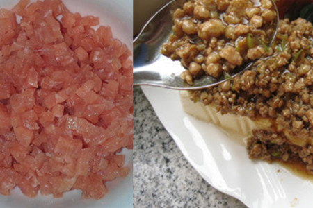 建议大家加入一些水淀粉放到猪肉末进去翻炒,会更加的合适。还需要切一些香葱,如果喜欢吃辣椒的人,可以加一些辣椒进去炒。炒好的肉末铺在皮蛋和豆腐上面。