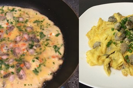 将准备好的蔬菜、牡蛎肉以及葱花都倒入鸡蛋液里面。还需要加入一些盐、味精、香油。将这些食材都搅拌好,充分的融合在一起。