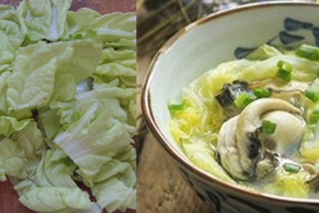 先将牡蛎的外壳去除干净。还需要准备现新鲜的白菜,同样也需要将它洗干净,用菜刀将它切成合适的块状,准备一些姜丝,可以去除牡蛎上面的腥味,切一些葱花,是可以增加汤的香味。