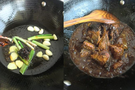 炒锅洗净上灶,倒入适量油烧热,油热之后,将葱姜和蒜瓣下锅爆香。葱姜和蒜瓣爆出香味之后,加入一大勺豆豉辣酱煸炒,炒出香味。接着将煎过的鲅鱼段回锅,调入适量白糖、老抽和清水,倒入制好的腐乳汁,转为大火继续烧二十分钟,直到锅里的汤汁变粘稠就可以关火了。豆豉辣酱和腐乳都很咸,所以盐不用加了。