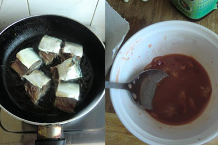 鲅鱼宰杀好,清洗干净,切成小段。平底锅洗净上灶,将鲅鱼段下锅煎制,煎成双面微黄。取一块腐乳和少量腐乳汁放入小碗中,用勺子把腐乳压碎。