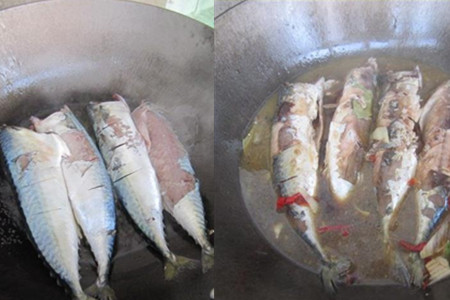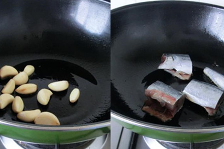 炒锅洗净上灶,开火加热,往锅中倒入油,油倒入之后,将去皮的蒜子下锅炸制,蒜子炸成焦黄即可盛出锅待用。接着将腌制好的鲅鱼段下锅煎制,煎成双面焦黄后盛出锅。