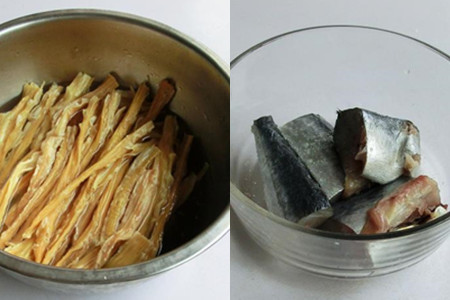 干腐竹浸在温水中泡软。鲅鱼宰杀好,清理干净,斩成小块,装入大碗中,加入适量盐和料酒,用手拌匀,腌制15分钟。蒜台清洗干净切寸段,泡软的腐竹切长段。