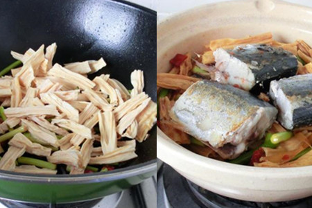 炒锅重新放油,油热之后,将姜丝、剁椒下锅煸炒。剁椒和姜丝炒香之后,将蒜台段下锅翻炒,再倒入腐竹段,调入适量白糖和生抽,炒匀后关火。砂锅洗净置于火上,放入炸好的蒜子,再依次加入炒好的腐竹蒜台和煎好的鲅鱼段,兑入适量清水,盖上盖,小火焖煮10分钟左右。