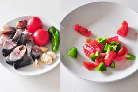 鲅鱼宰杀好,清理干净,斩成小段。番茄清洗干净,去皮切成小块,青椒洗净切小块。