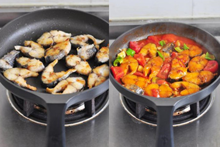 炒锅洗净上灶,开火烧热,倒入少许油,油热之后,将鲅鱼段下锅煎制。鲅鱼段煎金黄后,将它们拨到锅的一边,再将蒜姜下锅煸炒。姜蒜炒香之后,放入番茄块,调入适量番茄酱和白砂糖,兑入清水稍稍没过鲅鱼,大火煮沸后,调入适量食盐,转为小火烧15分钟。接着将青椒块下锅,转为大火把汤汁煮干即可关火。