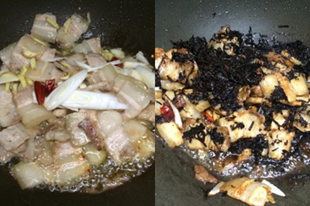 炒锅洗净上灶,放入适量油,油烧热之后,将事先切好的肉片放入,煸炒均匀。肉片煸出香味之后,将葱蒜片、姜丝和干红椒段下锅炒香。接着往锅里调入适量十三香和老抽,炒匀炒香。然后将滤干水分的梅干菜倒入锅中,撒入适量白砂糖,炒匀装盘,上蒸锅蒸制,直至肉片入味即可出锅。梅干菜不要冲洗太多遍,不然会失去自身的香味。