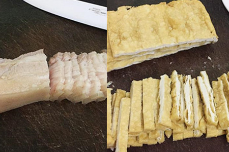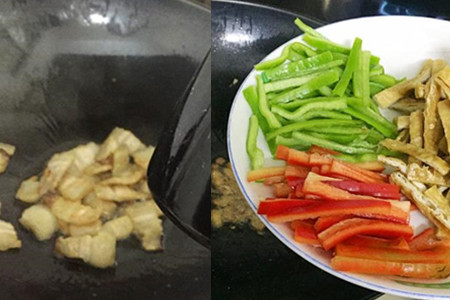 五花肉清洗干净,煮锅洗净上灶,加清水煮沸,将洗净的五花肉下开水焯至熟透,捞出滤干水分,切成小片。豆干洗净切成细丝,红青椒也已经切细丝。香葱洗净,去掉根部,切成寸段。