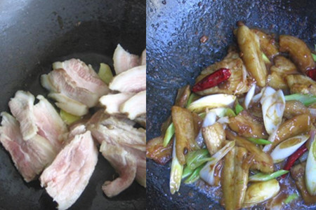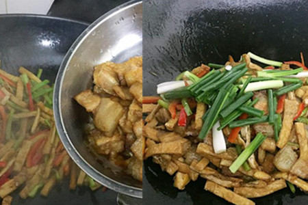 接着将炒好的五花肉片回锅,加入香葱段,加盖焖1分钟,即可关火起锅。全程都要大火快炒,这样口感更好。