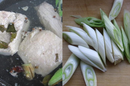 取适量黄豆酱装入碗中,调入少许清水,搅匀待用。煮锅洗净上灶,放入适量凉水,将五花肉洗净下锅,加入香叶、葱姜和花椒,开大火煮至肉块熟透,取出晾凉,切成大片。取大葱的葱白切成斜段。