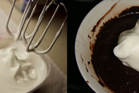 然后我们可以开始奶油的打发,将奶油打发到不会流动为止(也可以用蛋清代替奶油),然后将准备好的奶油放入巧克力溶液中,直到搅拌均匀。这一步尤其重要,能够决定蛋糕的口感和口味。