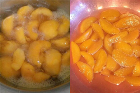 因为黄桃是水果所以本身就可以直接吃,因此我们不用把黄桃放在锅里煮很长的时候,只要感觉黄桃已经变软了我们就可以关火不煮了。我们可以把黄桃先倒在干净的盆子里面,等它全部变凉了之后,再把黄桃倒在刚才我们已经消毒完了之后的玻璃罐子里面。