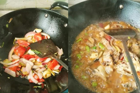 西红柿的汁炒出来之后,往锅中兑入适量开水,再把鲶鱼块下锅,烹入适量酱油和十三香,加盖,转为中火熬煮10分钟。10分钟后,揭开盖子,调入适量食盐,撒入杭椒段,再稍微煮片刻即可起锅。
