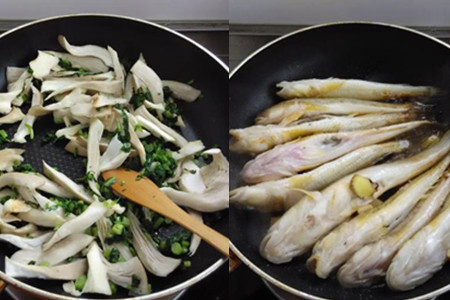 炒锅洗净上灶,倒入少许油,油热之后,将葱粒下锅煸炒。葱粒炒出香味之后,将雪里红丁下锅翻炒。雪里红丁炒至微微发软后,加入平菇条一起翻炒,两者都炒软后盛出锅备用。炒锅重新放适量油,将姜蒜片下锅煸香。姜蒜片煸出香味之后,将鲶鱼下锅煎制。鲶鱼一面煎硬之后,再换另一面煎一下,煎制过程调入适量白酒和生抽。