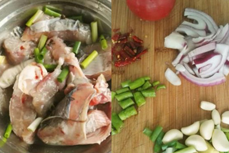 食材:鲶鱼1条、洋葱半个、西红柿1个、杭椒3个、干辣椒4个、料酒、十三香、青椒、蒜瓣、葱姜、老抽、盐、油。鲶鱼宰杀好,清洗干净,斩成大块,放入开水中焯一下,捞出装入碗中,加入葱段、花椒、姜、盐和料酒,用手抓一抓,腌制入味待用。洋葱洗净切小条,香葱洗净切段,青椒洗净切段,生姜削皮切片,大蒜剥皮待用。