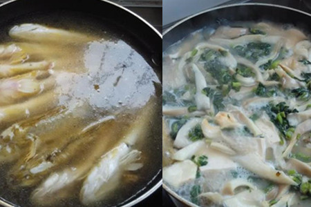鲶鱼煎好之后,兑入一大碗清水,转为大火煮沸。锅中的水煮沸之后,将豆腐块下锅,转为中火炖煮。锅中的汤汁炖至奶白色后,将炒好的雪里红平菇下锅,烹入适量鸡精、胡椒粉和食盐,继续煮片刻即可熄火起锅。煎鲶鱼的时候要用小火,避免将鲶鱼煎焦。