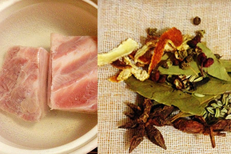 1、朋友们要从市场购买新鲜的五花肉,并切成大小一致的长方块,之后将五花肉块洗干净之后放入冷水锅中。等水开之后将表面的浮沫与血水去掉,并将五花肉捞出。准备适量的八角、花椒、陈皮等调味料装在一个纱袋之中。