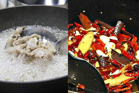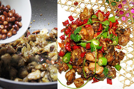 3、在锅里稍微留一些热油然后将切好的姜片、蒜末、辣椒以及花椒等放入锅中进行爆炒。等出现调味料的香味之后,再把鸡肉倒进锅中。然后加入适量的味精、盐以及炒熟的花生米。出锅之后上面还可以放两根香菜,这样这道菜看上去会更有食欲。