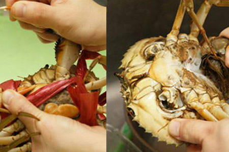 朋友们需要注意的是,因为螃蟹是活的,在清洗的过程中可能它们会奋力挣扎。如果担心被螃蟹夹伤,朋友们在清洗之前,可以将螃蟹前面的一对大螯掰下来,这样在清洗的过程中就不会被螃蟹弄伤。在清洗的过程中一定要用手将其抓牢,而且也不会被蟹腿扎伤。用这种方式能彻底地将螃蟹身体内部以及缝隙中的泥沙都清洗干净。