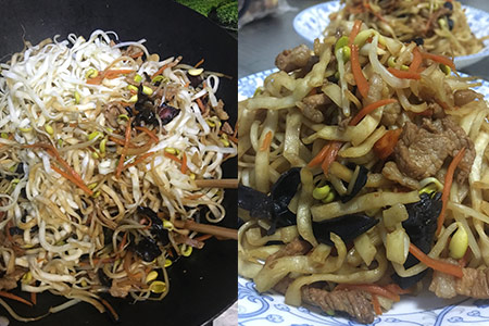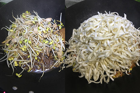 2、在锅内加入一些油,然后倒入肉片进行翻炒,之后加入黄豆芽。为了让味道更好,朋友们还要在其中加入一些盐和酱油。接着朋友们就可以加入木耳与胡萝卜丝,蔬菜炒至七成熟的时候可以加入蒸好的面条。