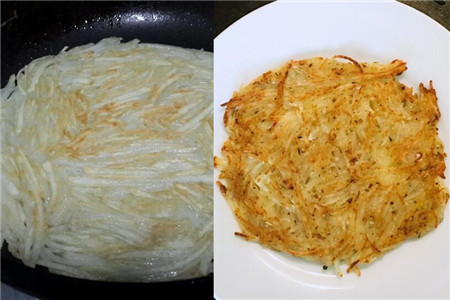 土豆丝与面糊完全搅拌在一起之后,就可以架锅开火,往锅里面倒一点点的食用油,将面糊倒在锅内,用锅铲将面糊摊平。然后可以在土豆面糊差不多成型的时候,将面糊换一个面继续煎,然后将土豆饼夹出即可食用。土豆饼其实有一定的营养,但是也不宜一次性吃过多的土豆饼,所以好吃的食物也不要太贪吃。