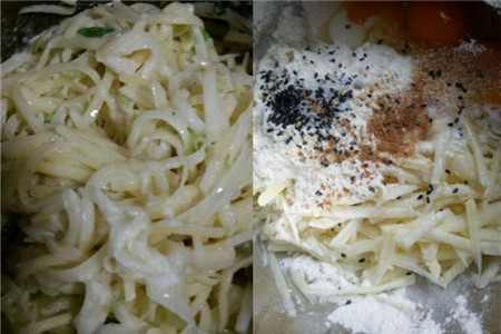 通常来说,我们都需要将土豆丝浸泡一段时间,10分钟左右即可。然后我们再将土豆丝捞出放在碗里面,这个时候土豆丝的表面还残留着一定的水分,我们可以趁此机会加入一些胡椒粉、食用盐、鸡精等调味料。这些调味料可以让土豆饼的味道变得更好,我们也可以利用土豆丝表面的水分将其搅拌均匀,这样可以让土豆丝更好的入味。
