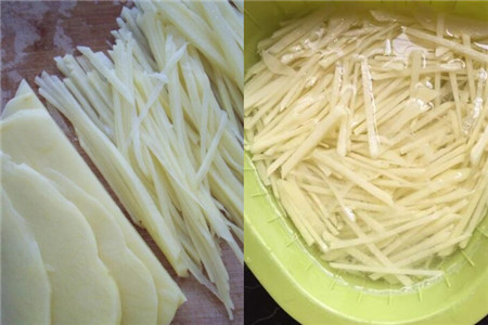 土豆当中的淀粉成分非常的丰富,但是淀粉非常容易糊锅,所以我们在制作的时候还需要稍微的将土豆当中的淀粉给清理一下。清理的过程非常的简单,我们可以用工具将土豆削成丝,如果家里面没有工具,也可以直接用刀将土豆切成丝。然后将土豆泡在水里面,这样可以防止土豆遇到空气而发生氧化变色,保证了土豆的色彩。