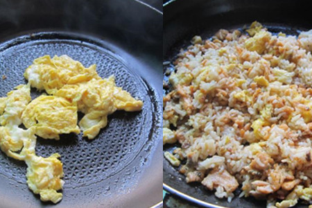 炒锅洗净上灶,放入适量油,油热之后,敲入鸡蛋炒熟,盛出锅待用。炒锅重新放油,油热之后,将三文鱼块下锅炒制。三文鱼炒熟之后,将事先调好的番茄汁倒入锅中,炒匀。接着将米饭下锅,加入炒熟的鸡蛋,调入适量生抽,炒匀即可熄火起锅。