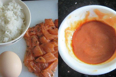 食材:米饭1碗、三文鱼150克、鸡蛋1个、番茄酱、生抽、白糖、油。
