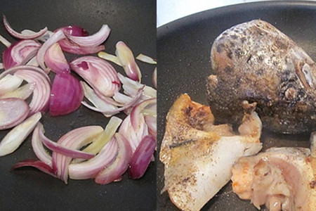 炒锅洗净上灶,放入少许橄榄油,油烧热之后,将洋葱条下锅炒香,盛出锅待用。炒锅重新放油烧热,将腌制入味的鱼头下锅煎制。鱼头双面煎至金黄后,兑入适量开水,大火煮沸。