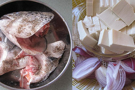 食材:三文鱼头1个、豆腐500克、橄榄油、洋葱、胡椒粉、盐。