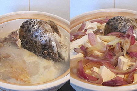 砂锅洗净上灶,将鱼头和汤汁转入砂锅,继续开大火炖煮。鱼头炖出味之后,将豆腐块放入,略微煮片刻,再将炒过的洋葱条放入,调入适量食盐和鸡精,搅匀就可以熄火了。