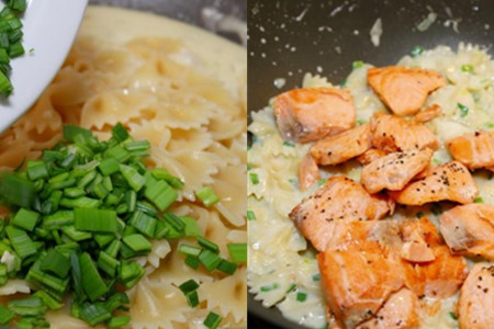 煮锅洗净上灶,加入小半锅清水,大火煮开,调入半勺食盐,将蝴蝶意面下开水煮制,煮至意面还剩一点硬心,即可捞出锅。将捞出的意面倒入过重的酱汁,同时加入蒜叶,炒匀,再将煎好的三文鱼块下锅,拌匀就可以享用了。如果家里有淡奶油,可以用淡奶油代替一部分牛奶,煮出来的酱汁更香更浓郁。