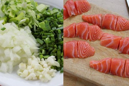 洋葱洗净切成小丁,大蒜剥皮拍碎,蒜苗的蒜白和蒜叶分别切碎。三文鱼清洗干净,切成小方块。