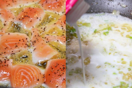 食材:蝴蝶意面200克、三文鱼300克、洋葱40克、黄油30克、蒜苗40克、面粉10克、牛奶350毫升、米酒1勺、柠檬汁1勺、大蒜、胡椒粉、盐。