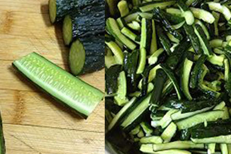 1、朋友们可以从市场购买比较新鲜的黄瓜,然后用清水洗干净,并将黄瓜切成圆柱状,之后再从黄瓜的中间对半切开。朋友们在切的时候一定要保证黄瓜条大小一致,然后将它们放入无油的容器之中。