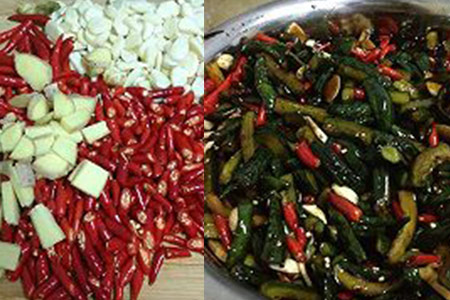 2、将已经切好的黄瓜条用盐腌一整天,而且还要将其经常翻一下。之后将蒜、辣椒以及姜都切成片。如果有新鲜的姜那味道会更好一些,然后将做好的调料放入黄瓜条中,并搅拌均匀。