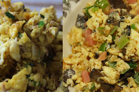 3、将炒锅加热并倒入食用油,之后将黑松露蛋液倒入到炒锅之中,轻轻地摇晃炒锅,这样煎出来的蛋才会更松软。另外,朋友们还可以在其中加入一些香肠粒,这样能让这道菜的味道变得更好。